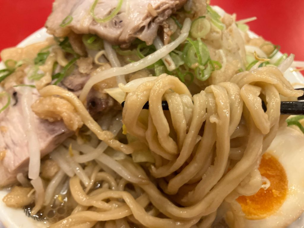あらよっと。腕に来る重さです。麺はめっちゃ太い上に硬めで、最初苦労しましたが猫田の悪い歯でもなんとかガシガシいけました。小麦の香りかなり強め。コシも強くなかなか旨い。