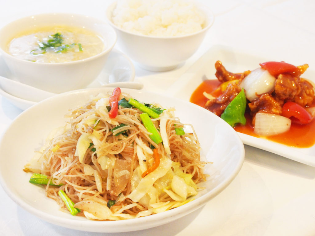 こちら、お昼はお得なランチがあるんですがシステムがわかりにくい(猫田が歳なので)。Aランチ900円は日替わりの一品に焼ビーフン、スープ、ご飯。Bランチ900円は焼ビーフンに前菜盛り合わせ、スープ、ご飯。日替わりランチ950円は日替わりの一品に前菜盛り合わせ、スープ、ご飯。日替わりランチにはビーフンが付かず、450円プラスでビーフン付きになります。